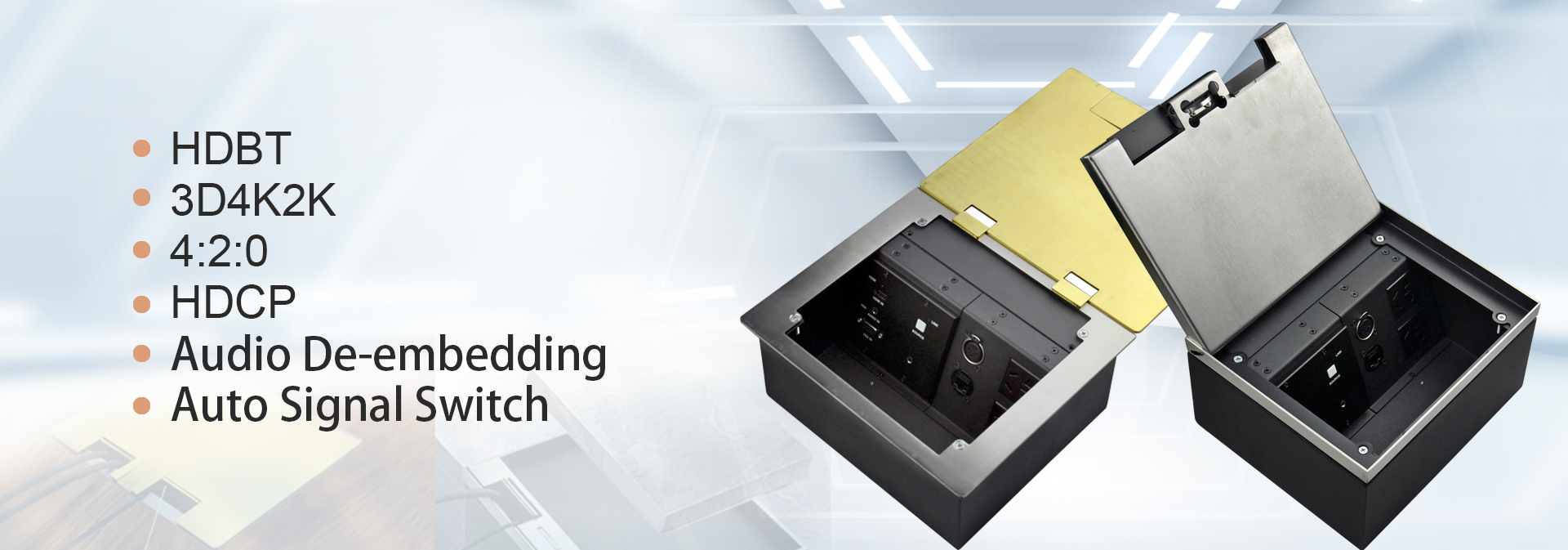 JS series interconnect box is to remove the obstacles by combine all sockets in one plate and special designed conceal structure. It is ? ush- mounted on tabletop with cables connected under table in orderly. Users just need to open the top panel that all ports or cables will appear for use.