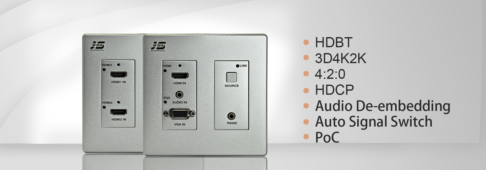 JS-HDBaseT series twisted pair interconnect box transmitter enabling uncompressed high definition video, audio signal transmission, over a single twisted pair cable for up to 100m/328ft(70m/230ft).